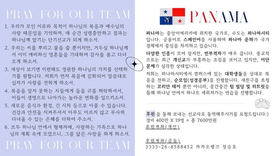 추신) 파나마 단기선교팀을 위한 기도제목