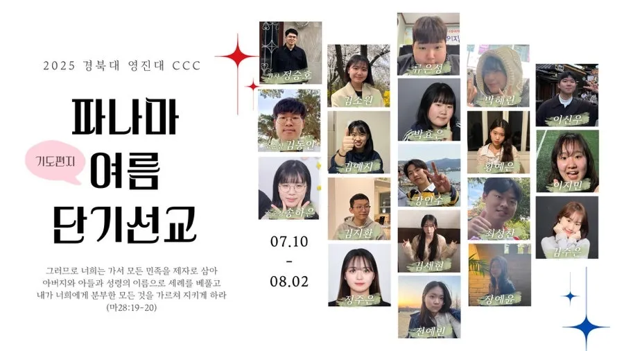 7/10부터 8/2까지 경북대학교&영진전문대학교 CCC에서 단기선교를 옵니다. 기도편지에 적힌 기도제목들을 두고 함께 기도해주시길 부탁드립니다.